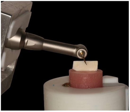 Dentine discs of 1 mm thickness were obtained from the lingual side of 10 bovine teeth crowns by cutting two parallel cuts extending from the incisal edge to the cingulum of the crown. The 20 paired half discs were assigned to one of the tested systems (10 specimens per group). In other words, each disc was cut into 2 parts for further testing using each system. The dentine side was then mounted perpendicular to the tested system holder. The tested file (F2 or Primary) was inserted in the handpiece while left free-falling on a 350 g ball bearing slide in the Z-axis direction (Figure 6).