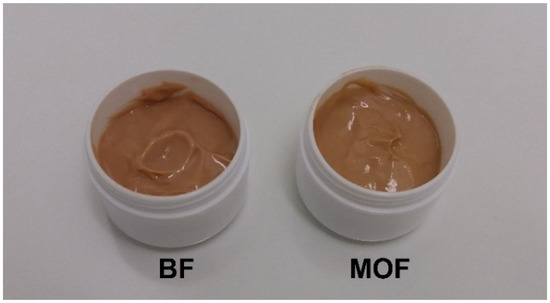 Images of the cosmeceutical formulations developed: base formulation (BF) and formulation with microcapsules of coffee oil (MOF).
