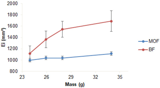 Spreadability of cosmeceutical formulations: base (BF) and with microcapsules of coffee oil (MOF). Triplicate mean; error bars: standard deviation.