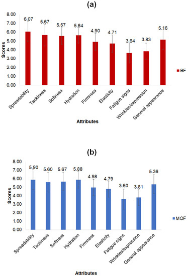 Results of sensory evaluation of cosmeceutical formulations: base (BF) (a) and with microcapsules of coffee oil (MOF) (b). Mean values of 58 evaluations; error bars: standard deviation; no significant difference (by t test, p > 0.05) between BF and MOF for the attributes evaluated.