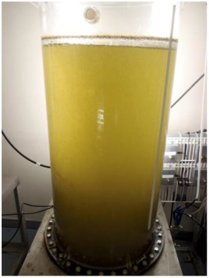 Nostoc verrucosum cultured in a cylindrical tank under a fluorescent light.