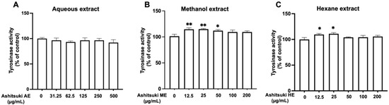Effect of N. verrucosum (ashitsuki) extracts on tyrosinase activity. Effect of N. verrucosum aqueous (A), methanol (B), and hexane (C) extracts on monophenolase activity was measured. Results are represented as percentages of the control; the data are shown as mean ± SEM of three separate experiments. * p < 0.05, ** p < 0.01 versus the control group.