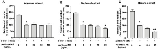 Effect of N. verrucosum (ashitsuki) extracts on the proliferation of B16F1 melanoma cells. B16F1 melanoma cells were treated with N. verrucosum aqueous (A), methanol (B), and hexane (C) extract for 3 d, in the presence of 10 nM α-melanocyte-stimulating hormone (α-MSH). After treatment, the trypan blue exclusion test was performed, and the cell proliferation rate was assessed. Results are represented as a percentage of the α-MSH-alone-treated control group; the data are shown as mean ± SEM of three separate experiments. # p < 0.05 versus the control group. * p < 0.05, ** p < 0.01 versus the α-MSH-alone-treated control group.