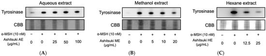 Effect of N. verrucosum aqueous (A), methanol (B), and hexane (C) extracts on intracellular active tyrosinase. B16F1 melanoma cells were treated with N. verrucosum extracts for 3 d in the presence of 10 nM α-MSH. After treatment, cell lysates were subjected to SDS-PAGE and DOPA staining was performed.