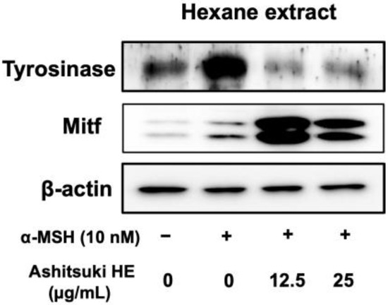 Effect of N. verrucosum (ashitsuki) hexane extract on tyrosinase and Mitf protein levels. B16F1 melanoma cells were treated with N. verrucosum hexane extract for 72 h in the presence of 10 nM α-MSH. After treatment, total cell lysates were prepared, and western blot analysis was performed.
