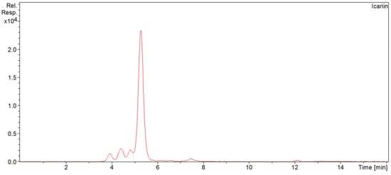 The icariin concentration in the commercially available extract of Epimedium L. (Species: Epimedium Koreanum) was determined using a Kinetex column 2.6 µm C18 (2.1-id x100 mm). Analysis conditions were as follows: column temperature of 35 °C, injection volume of 3 µL, and mobile phase flow of 0.3 mL/min. The mobile phases were A: water + 0.1 wt.% formic acid, and B: acetonitrile + 0.1 wt.% formic acid. Elution was performed using a stepwise gradient elution shown in Table 2.
