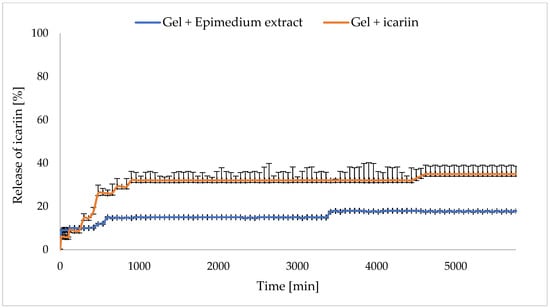 Demonstrating the possibility of a topical product’s therapeutic effects can be challenging. In this study, the potential of active ingredients to permeate the skin was shown. However, the obtained results of the release study do not reflect the actual degree of skin permeation but refer only to the accumulated amount of the active ingredient, as it was impossible to account for the interaction between the skin components and the lipid barrier that naturally occurs on the skin. We obtained the release of icariin at a level of 15.0–19.0% for the substance derived from the plant extract, and at a level of 29.0–35.0% for the pure substance. In both cases, the release was higher than for oral administration (by about 12.0%).