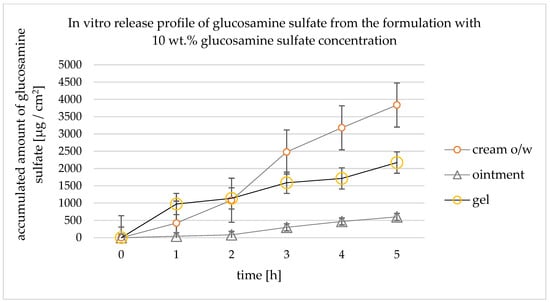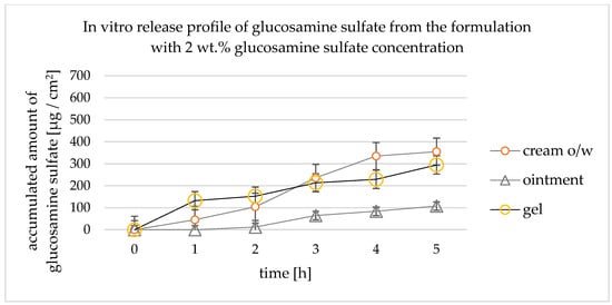 The in vitro active ingredient cumulative release from the formulations was on average 38.4% for the creams and 21.7% for the gels after 5 h. The formulations with all the concentrations had similar release profiles; initially, glucosamine was released from the gel formulations much faster, but ultimately, the glucosamine was released from the cream formulation in higher concentrations (Figure 3, Figure 4 and Figure 5).