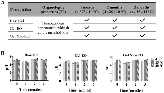 Evaluation of organoleptic properties (A) and pH (B) of gel samples (Base Gel, gel containing EO (Gel-EO) and gel containing EO-loaded chitosan nanoparticles (Gel NPs-EO)) at 4, 25 and 40 °C, over 3 months. Results are shown as the means ± SDs of 3 replicates.