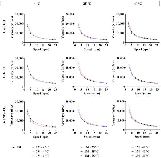 Evaluation of the viscosity (mPa·s) profiles of the prepared formulations: Base Gel, Gel-EO and Gel NPs-EO stored for 0, 1, 2 and 3 months (0 M, 1 M, 2 M and 3 M) at 4, 25 and 40 °C. Results are shown as the means ± SDs of 3 replicates.
