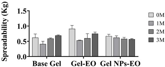 According to the results of the spreadability analysis shown in Figure 3, base gel and gel containing EO were within a range that indicates their capacity to be easily spread over the skin and to adhere to the skin, providing sustained delivery of the bioactive principles. In addition, gel containing chitosan NPs presented the most consistent results along the three months of storage at 25 °C, probably indicating that the presence of chitosan played an important role in maintaining the gel properties over time. This could have been due to the electrostatic interaction of chitosan (positively charged) with Carbopol (polyacrylic acid, negatively charged), forming a more stable gel network [31,32].