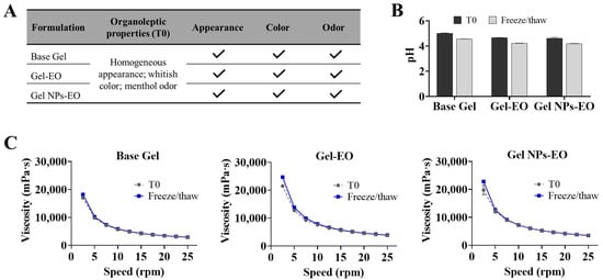 Evaluation of the organoleptic properties (A), pH (B) and viscosity (C) of the gels (Base Gel, gel containing free EO (Gel-EO) and gel containing EO-loaded chitosan nanoparticles (Gel NPs-EO)) after preparation (T0) and after five freeze/thaw cycles. Results are shown as the means ± standard deviations (SDs) of 3 replicates.