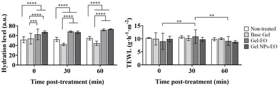 Effect of gel formulations (non-treated), Base Gel, gel containing free EO (Gel-EO) and gel containing EO loaded-NPs (Gel NPs-EO)) on hydration (arbitrary units; a.u.) and transepithelial water loss (TEWL, g·h−1·m−2) levels at 0, 30 and 60 min post-application in a delimited area of the volunteers’ forearm skin. Three volunteers participated in the study. Results are shown as the means ± SDs of 5 measurements for each treatment and at every time point under study, ** p < 0.01, *** p < 0.001, **** p < 0.0001.