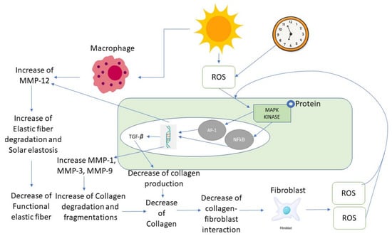 Collagen, elastin, and glycosaminoglycans (GAGs) are the three major targets for designing anti-aging strategies [17]. The extracellular matrix (ECM), a macromolecular network, contains collagen, elastin, hyaluronic acid (HA), proteoglycan, etc. which maintain the cell regulation, growth, and differentiation needed for youthful-looking skin. Excessive degradation of ECM leads to skin aging due to the deregulation of Matrix Metalloproteinases (MMPs). ECM is a zinc-dependent endopeptidase regulated by the specific endogenous tissue inhibitors of metalloproteinases (TIMPs) [18,19,20,21]. Reduced levels of TIMP-1 may elevate the amount of MMPs, thus accelerating skin aging. Additionally, the degradation of TIMP-1 is prominently caused by Reactive Oxygen Species (ROS) [20,22,23,24,25]. The mitogen-activated protein kinase (MAPK) family is activated by ROS, and this activation further activates the transcription factor activator protein 1 (AP-1). As a result, the transcriptional regulation is maintained of MMP-1, MMP-3, MMp-9, and MMP-12. The family members of MMPs such as MMP-1, MMP-2, MMP-3, MMP-9, MMP-10, MMP-11, MMP-13, MMP-17, MMP-26, and MMP-27 have been found to be responsible for skin aging [26,27,28,29,30]. The AP-1 activation thus causes collagen degradation leading to aged skin. In addition, UV ray also activates nuclear factor-κB (NF-κB), which plays a role in photoaging by increasing the levels of MMP-1 and MMP-3 causing collagen degradation and leading to deep wrinkles. Both AP-1 and NF-κB elevate the level of matrix metalloproteinase (MMP) expression, and that hinders the growth of transforming growth factor-β (TGF-β) signaling that leads to collagen fragmentation and a decreased amount of collagen synthesis. Moreover, MMP-12 obtained from macrophages and fibroblasts causes solar elastosis and reduces the functional elastic fibers in our skin [31,32,33,34,35,36,37].