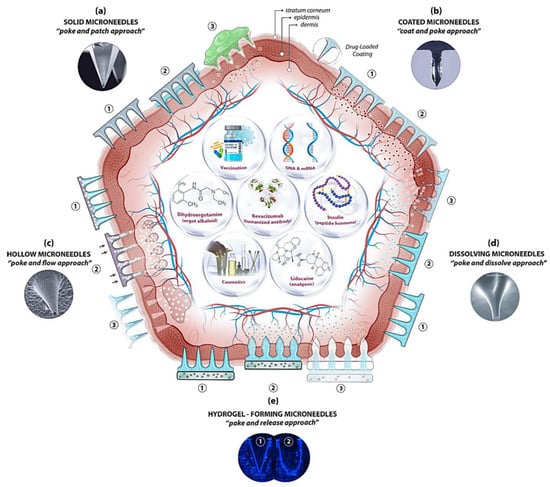 Drug delivery via different types of MNs: (a) solid MNs, (b) coated MNs, (c) hollow MNs, (d) dissolving MNs, and (e) hydrogel-forming MNs. The step-by-step process of each delivery approach is numbered from 1 to 3 [56].