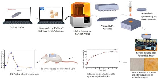Microneedles (MNs) in the cosmeceutical treatment of wrinkles are one the most promising approaches because of their minimally invasive system; in addition, they can easily overcome the drawbacks of conventional treatments [40,41,42]. There are many techniques that have been established to date to fabricate these MNs such as thermal inkjet printing, stereolithography, micro-electromechanical systems, etc. [43,44,45].
