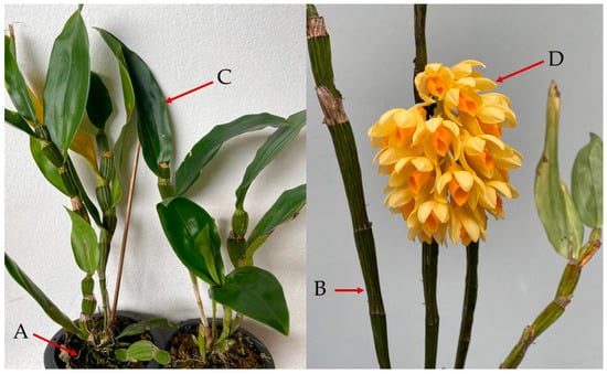 The different parts of D. sulcatum: (A) root, (B) stem, (C) leaf and (D) flower.