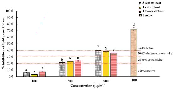 Anti-lipid-peroxidation activities of D. sulcatum ethanolic extract from stems, leaves and flowers (at the final concentration of 100, 300 and 500 µg/mL) using thiobarbituric acid reactive substances (TBAR) assay. Each value represents the mean ± SD (n = 3). The different letters are significantly different (p < 0.05) according to Tukey’s HSD test. The last column depicts Trolox (100 µg/mL) which was used as the positive control. Samples exhibiting <20% inhibition were considered inactive, 20–30% inhibition was low activity, >30–40% inhibition was moderate activity and >40% was considered as active [26].