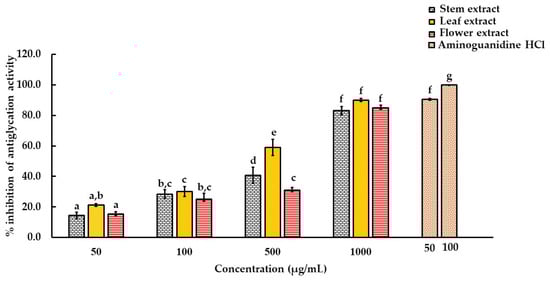 Effect of ethanolic extract of D. sulcatum stems, leaves and flowers on antiglycation activity using a BSA-fructose assay. Each value represents the mean ± SD (n = 3). The different letters are significantly different (p < 0.05) according to Tukey’s HSD test.
