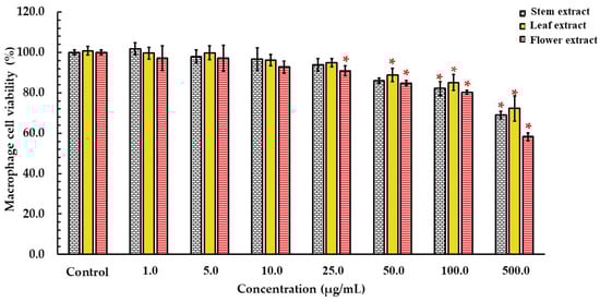 Effect of ethanolic extract of D. sulcatum stems, leaves and flowers on macrophage cell viability using MTT assay. Each value represents the mean ± SD, (n = 3). * Significantly different versus the control (p < 0.05, Student’s t-test).