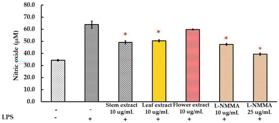 Effect of ethanolic extract of D. sulcatum stems, leaves and flowers (10 µg/mL) and L-NMMA (10 µg/mL and 25 µg/mL) on NO inhibition. Each value represents the mean ± SD, (n = 3). * Significantly different versus the LPS-induced control at p < 0.05 Student’s t-test.
