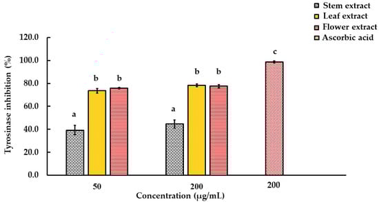 Effect of ethanolic extract of D. sulcatum stems, leaves and flowers (50 and 200 µg/mL) on tyrosinase inhibition; the last column depicts ascorbic acid (a positive control, 200 µg/mL). Each value represents the mean ± SD, (n = 3). The different letters are significantly different (p < 0.05) according to Tukey’s HSD test.