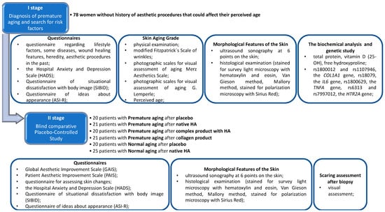 The research was conducted at the Shared Core Facilities of Molecular and Cell Technologies (V.F. Voino-Yasenetsky Krasnoyarsk State Medical University, Russia). The study included 2 stages (Figure 1). In the first stage, we examined factors associated with premature skin aging. In the second stage, a blind, comparative placebo-controlled study of the effectiveness of intradermal injections for the treatment of involutional skin changes was conducted.