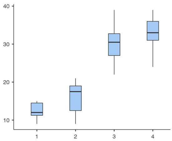 The index of involution changes of the skin in patients of the main group and the comparison group, where on the axis OX: 1—patients 35–40 years from the comparison group; 2—patients 41–45 years from the comparison group; 3—patients 35–40 years from the main group; 4—patients 41–45 years from the main group. The sum of points is reflected on the axis OY vertical.