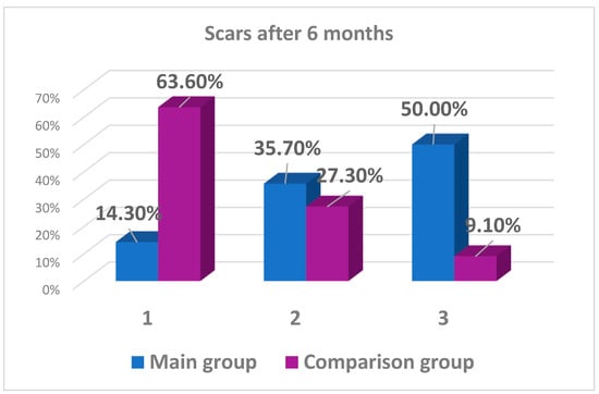 In patients of the main group, scarring disorder was statistically significantly more common: a wide scar or a scar in the healing stage was exhibited by 85.7% patients of the main group (Figure 3).