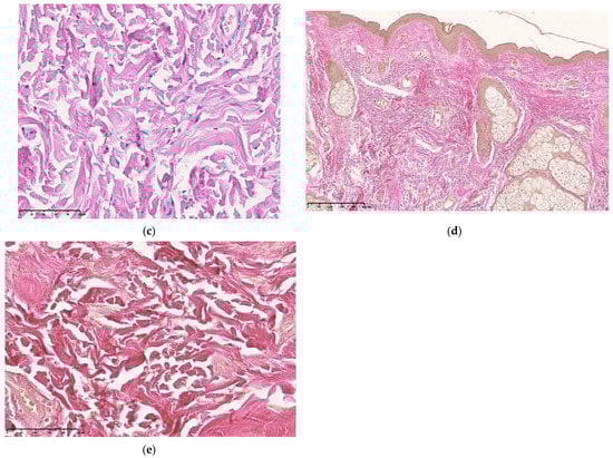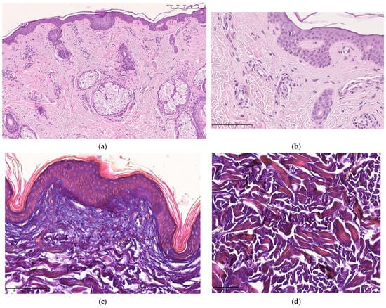 It should be noted that thickened collagen fibers are visualized in the field of view in the papillary layer of the dermis, which indirectly indicates the activation of collagenogenesis and reduces the severity of the border between the papillary and reticular layers. The thickness of the papillary layer is reduced. In the reticular layer of the dermis, connective tissue fibers are thickened and form coarse bundles of fibers, between which single thin fibers are visualized. It should also be noted that there is an increased accumulation of collagen fibers, with a certain structure in the location, near the hair follicles and sebaceous glands (Figure 8d).