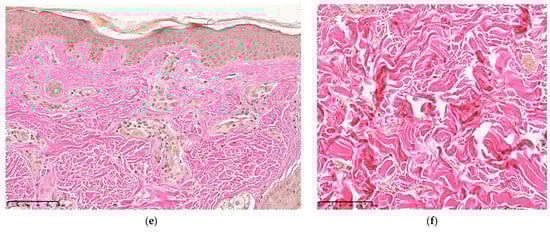 After treatment of patients with premature aging with native HA, unexpressed changes are visible in the papillary layer of the dermis. The increased density of the fiber arrangement is visible. In the reticular layer, the bundles of collagen fibers are thick, the inter-fiber gaps are expanded. The border between the papillary and reticular layers is weakly expressed (Figure 7c,d).