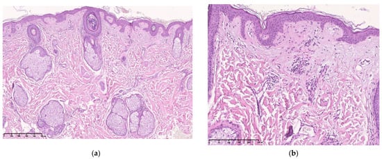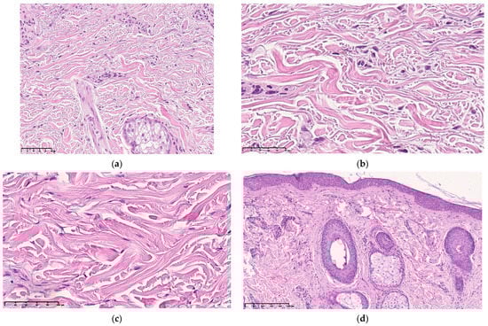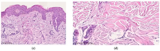 Microscopy in a group of patients with premature skin aging after collagen treatment also shows the pattern of morphological changes detected. The epidermal–dermal border is undulating, the papillae formed by the epidermis are not deep and wide (Figure 8c).