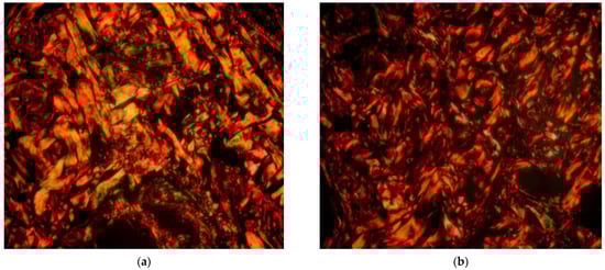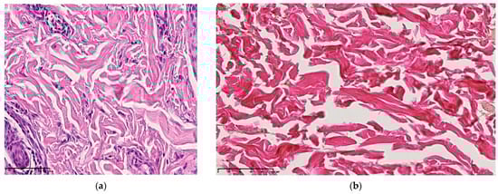 In the group of patients with premature aging of the skin after treatment with complex product of HA, there was a pronounced dynamic of morphological changes. There was an increase in the cross-sectional area of the papillary layer of the dermis, an increase in the density of cells in it per unit area of the section (Figure 8a); the visualized small blood vessels are blood-filled. There is a gradual transition from the papillary to the reticular layer. In the reticular layer of the dermis, the inter-fiber gaps are very wide, a significant number of thin newly formed fibers are visualized in the field of view, the intensity of the color of the fibers is different, which indirectly indicates a different degree of their maturity. The density of structured matter per unit area of the section is less, the ratio of structured to unstructured matter is shifted towards the latter. Additionally, for the pronounced heterogeneity of fibers, it should be noted that thin single fibers are visualized between fiber bundles without a tendency to merge into bundles (Figure 8b). The density of cells in all layers of the skin is increased. In the dermis, fibroblastic differon cells and macrophages predominate in the field of vision.