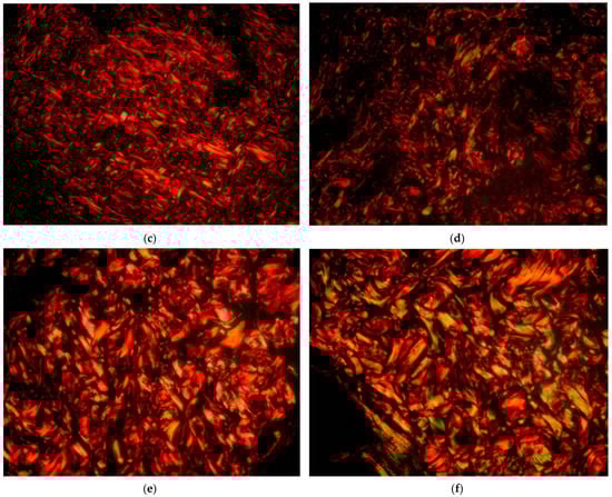 Micrograph of the skin section of patients: (a) patients with normal skin aging before treatment; (b) patients with normal skin aging after treatment with native hyaluronic acid; (c) patients with premature skin aging before treatment; (d) patients with premature skin aging after native hyaluronic acid; (e) patients with premature aging of the skin after the complex product of hyaluronic acid; (f) patients with premature aging of the skin after collagen. Stained by Sirius Red. Polarization microscopy, ×400.