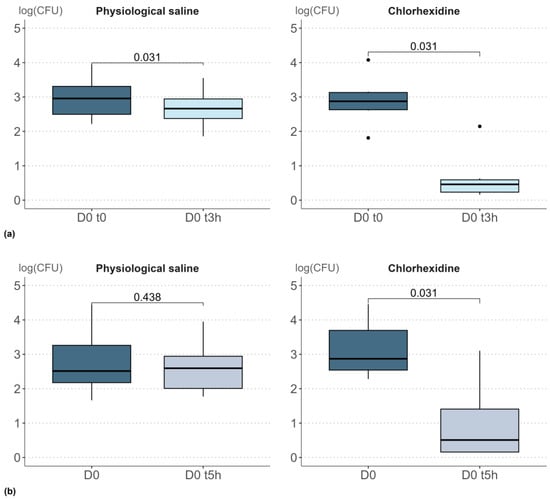 Following a single application of chlorhexidine, a stronger impact was observed. Both 3 h and 5 h after the initial sampling, a decrease in bacterial count was observed, with an order of magnitude of −2.2. Based on these outcomes, a 5-h time-lapse was selected for subsequent studies (studies 3 and 4) to prevent any short-term impact of biomass removal.