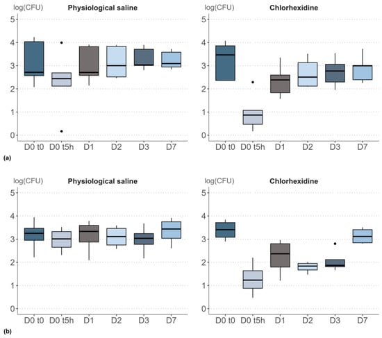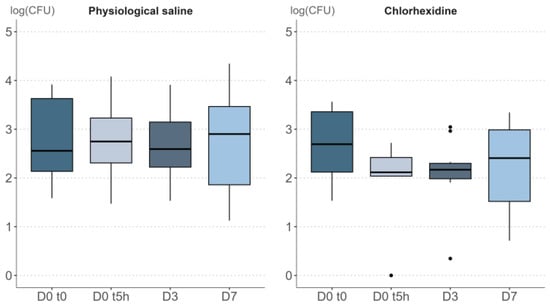 Table S3. Application of physiological saline led to a decrease in bacterial density between D0 t0 and D0 t5h, with log values of 0.7 (study 3) and 0.1 (study 4). Application of chlorhexidine produced a stronger decrease, with log values of 2.0 (study 3) and 1.6 (study 4).