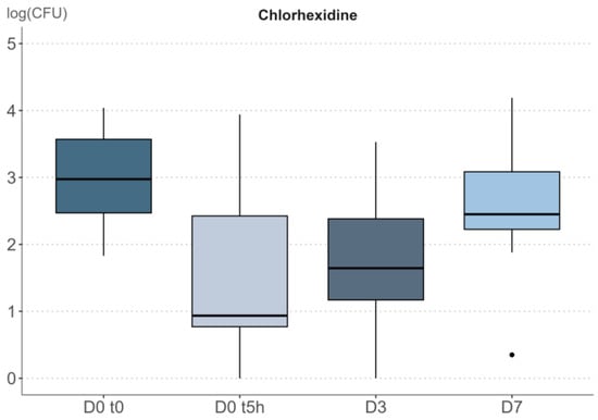 As previously observed, repeated applications of chlorhexidine over three days produced a highly significant decrease of bacterial density (Friedman’s p-value = 3.7 × 10−5).