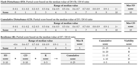 A strong effect was observed after 5 h and after 3 days, with median values of 0.129 and 0.293 for D0 t5h/D0 t0 and D3/D0 t0, respectively. Based on these median values, the FD, CD, and R scores attributed were 1, 2, and 2, respectively. The cumulative score was therefore 5, which corresponds to the lowest viability score—E.