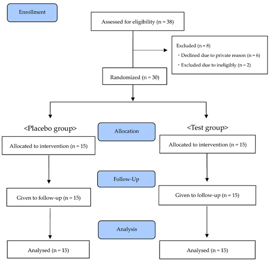 Of the 38 participants recruited, 30 participants who met the eligibility criteria and gave their agreement were enrolled in this study. Thirty participants were allocated to the test group or the placebo group. From January 2022 to March 2022, 30 healthy adults completed the study (Figure 1). The background characteristics for each group are shown in Table 4. There were no significant differences between the two groups in terms of sex, age, body mass index, or other evaluation values at baseline.