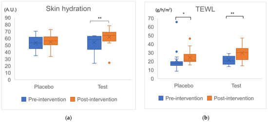 Change in cheek skin parameters in total 30 participants. Figure (a): Changes in Skin hydration, (b): Changes in TEWL (transepidermal water loss), a.u.: arbitrary unit. Dots beyond the bounds of the whiskers denote outliers. Cross marks and horizontal lines indicate means and medians for each group. Asterisks indicate significant difference in intragroup after the intervention. *: p < 0.05, **: p < 0.01.
