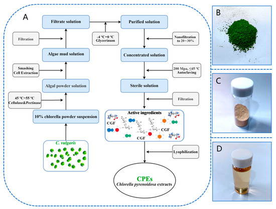 Figure 1. The extraction process of CPEs (A) and images of Chlorella pyrenoidosa (B) and its ex–tract (C) lyophilized powder; (D) aqueous solution.