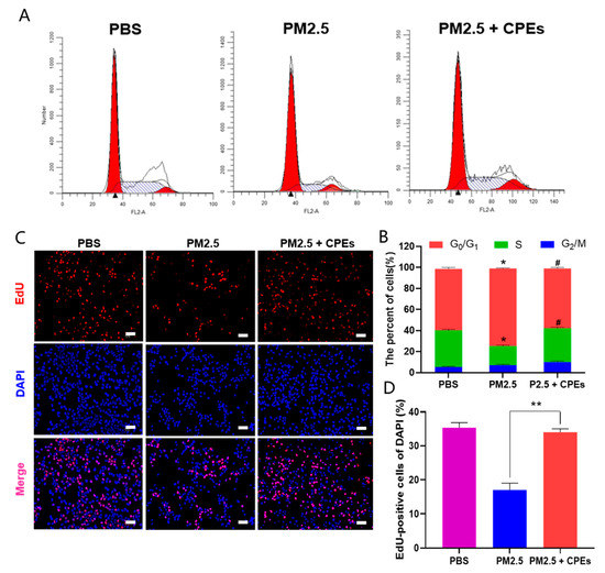 Figure 5. Effects of PM2.5 and CPEs on proliferation ability of fibroblasts. Cells were treated with PM2.5 (100 μg mL−1) or plus CPEs (10 mg mL−1) for 24 h. (A) Flow cytometry was used to analyze the changes in the cell cycle after PM2.5 or plus CPE treatment. (B) CPEs increased the proportion of S-phase cells resulting from PM2.5 treatment. (C) 5-ethynyl-2′-deoxyuridine staining (EdU, red) was used to indicate S-phase cells, and DAPI (blue) was used for nuclei staining (scale bar: 40 μm). (D) Proliferation rate was significantly restored from the CPE-treated groups. All results are expressed as mean ± SD of three biological replicates. (B) * p < 0.05 compared with PBS; # p < 0.05 compared with PM2.5. (D) ** p < 0.01 compared with PM2.5.
