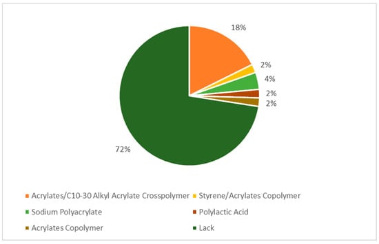 Very few studies contain analysis of purifying products containing microbeads in the formulation, for the purpose of identification. The microsphere content of the final product can range from 0.05% to 12%, so it is impossible to accurately calculate the average content in cosmetic products. Nevertheless, new studies have shown a significantly lower percentage of microspheres in peeling and cleansing products [15,20]. These values are expected to gradually decrease as most companies voluntarily, or under legal pressure, begin to phase them out. In the present study, out of 50 cosmetics analyzed, 37 did not contain any type of microplastic. Only 13 products contained it (of which one formulation contained two types of microplastic), and the most common was Acrylates/C10-30 Alkyl Acrylate Crosspolymer. Most of the cosmetics tested were characterized by an all-natural composition. This is a big change from previous studies [15,19,20].