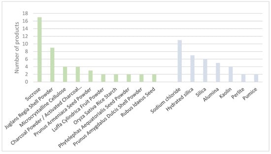 The place of microplastics is increasingly beginning to be supplanted by natural ingredients with abrasive capacity. Piotrowska et al. [19], in a study conducted in 2017, showed that, out of 130 cosmetics, 80 contained natural abrasive particles, where the most common natural exfoliating ingredients in cosmetics containing polyethylene were crushed seeds and microcrystalline cellulose, whereas seeds, sugar and salt were the most common such ingredients in cosmetics with natural ingredients. In the present study, natural abrasive particles appeared in 49 of the cosmetics analyzed, but the most common ingredients were sugar, sodium chloride and powdered walnut shells. Sugar was the most common vegetable substitute for microplastic, whereas sodium chloride was the most common mineral substitute. Only one formulation did not contain any natural ingredient with an abrasive effect [19].