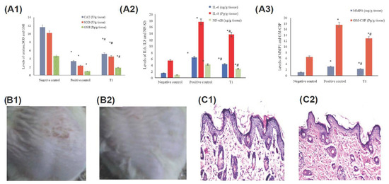 (A1) Antioxidant, (A2) anti-inflammatory, and (A3) anti-aging activities of RES suspension (T1), compared with the control groups (positive and negative). * Statistically significantly different from the normal control group (p < 0.05) # Statistically significantly different from the T1 group (p < 0.05). Photographs of the rats’ dorsal skin: (B1) positive control group and (B2) irradiated followed by topical pre-treatment with RES suspension. Histopathological observation of the rats’ dorsal skin: (C1) positive control group and (C2) irradiated followed by topical pre-treatment with RES suspension. Adapted from [65].