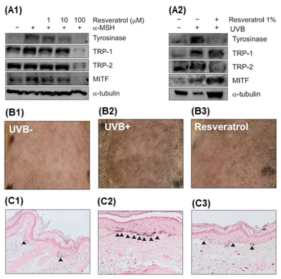In other studies, the effect of RES in the presence of exposure to UVB was evaluated. In a study using dark-skinned Yucatan swine, topical therapy with 1% RES over 8 weeks provoked visible skin lightening without signs of irritation or additional undesired effects [86]. In an additional study using light-skinned Yucatan swine, skin tanning was promoted by exposing the animals to one minimal erythema dose of UVB, on three alternate days. Treatment with 1% RES over 2 weeks, after each UVB exposure, and on non-UVB exposure days, diminished UVB-induced pigment deposition. Lee et al. (2014) evaluated the influence of RES on pigmentation in brownish guinea pig skin with UVB-induced hyperpigmentation. In addition, the effects of RES in stimulated α-melanocyte-stimulating hormone (α-MSH) B16F10 mouse melanoma cells were also evaluated. The results showed that RES reduced melanin production and the underlying mechanisms are the reduced expressions of melanogenesis-related proteins tyrosinase, tyrosinase-related proteins (TRP) 1 and -2 (TRP-2), and microphthalmia-associated transcription factors (MITF) in melanoma cells (Figure 3(A1)). The expressions of tyrosinase, TRP-1 and TRP-2, and microphthalmia-associated transcription factor in the skin tissue of guinea pigs were also evaluated, showing a reduction (Figure 3(A2)). Furthermore, the dorsal skin of brown guinea pigs of the UVB-negative group (Figure 3(B1)), UVB-positive group (Figure 3(B2)), and UVB+ and 1% RES (Figure 3(B3)) group treated for 2 weeks showed that the topical application of RES significantly decreases hyperpigmentation on UVB-stimulated guinea pig skin in vivo. Based on histological results using Fontana-Masson stain for melanin in the skin of brown guinea pigs from the UVB-negative group (Figure 3(C1)), UVB-positive group (Figure 3(C2)), and UVB+ and 1% RES (Figure 3(C3)) group treated for 2 weeks, RES inhibited melanin synthesis, supporting RES as a depigmentation agent. Thus, these results showed that RES inhibits melanin synthesis in both models, and also supports the fact that RES could be a potential skin-whitening active ingredient [87].