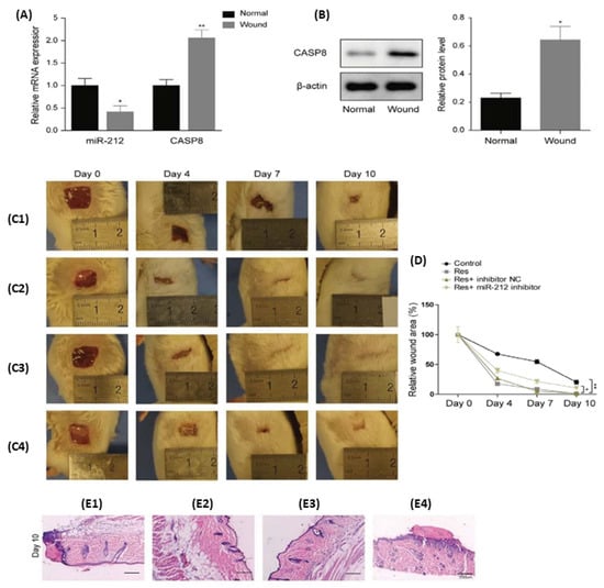 The effect of RES, RES + miR-212, and RES + inhibitor NC on mice wound healing: (A) measure of miR-212 and CASP8 ranges with relative mRNA expressions; (B) measure of miR-212 and CASP8 abundances with relative protein level. Wound area was measured for 10 days in (C1) control group; (C2) RES-treated group; (C3) Res + inhibitor NC-treated animal group; (C4) Res + miR-212 inhibitor-treated animal group. (D) Comparative analysis of all the treated groups determining a relative wound area (%) over several days. (E1) Wound tissues of the control group were stained with HE on day 10; (E2) wound tissues of RES-treated group were stained with HE on day 10; (E3) wound tissues of RES + inhibitor NC-treated group were stained with HE on day 10; (E4) wound tissues of RES + miR-212-treated group were stained with HE on day 10. (* p < 0.05, ** p < 0.005). Adapted from [93].