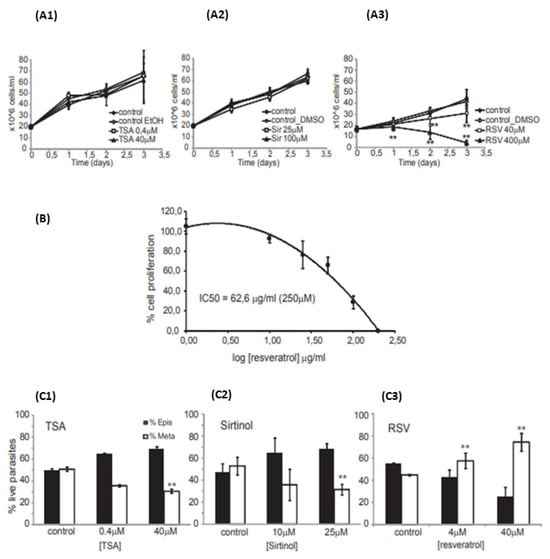 Values expressed as a percentage of trypomastigotes and epimastigotes, with varying concentrations of each compound to treat the parasitic infection. (A1) represents epimastigotes incubated for 48 h, a linear graph depicting a growth with varying concentrations of TSA (trichostatin); (A2) depicts the growth curve of parasites with different sirtinol concentrations; (A3) shows a prediction of the growth curve with varying concentration of RES; (B) shows that IC50 (inhibitory medium concentration) values were calculated by counting live parasites; (C1) the incubation of parasites with TSA (Trichostatin) exhibits varying concentrations of the compound, which displayed a significant rise (around 10–20%); (C2) sirtinol showed significant elevation; (C3) with RES, parasitic infection declined as compared to the control. The values exhibited statistical significance when compared to the control (** p < 0.005). Adapted from [54].