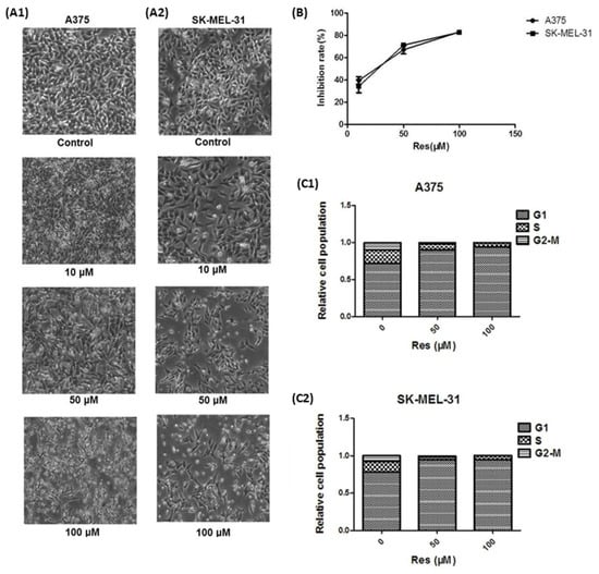 RES with different concentrations inducing decreased cell viability in A375 and SK-MEL-31 cells. (A1) A375 cells are treated with varying concentrations of RES, which shows RES-induced inhibitory cell proliferation; (A2) SK-MEL-31 cells are treated with varying concentrations of RES, which shows RES-induced inhibitory cell proliferation; (B) inhibition rate (%) vs. RES of A375 and SK-MEL-31 cells; (C1) the A375 cells incubated for 48 h with growing RES amounts; (C2) the SK-MEL-31 cells incubated for 48 h with growing concentration of RES. Adapted from [115].