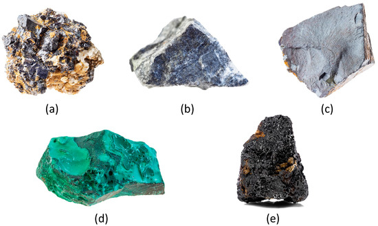 Minerals used in ancient Egypt for cosmetic preparations: (a) galena and sphalerite, (b) stibnite, (c) hematite, (d) malachite, and (e) manganese ore. Hematite is the primary ingredient in brown ochre. Photographs of the minerals by KrimKate were obtained through a license agreement with iStock (Getty Images), Calgary, Alberta, Canada.